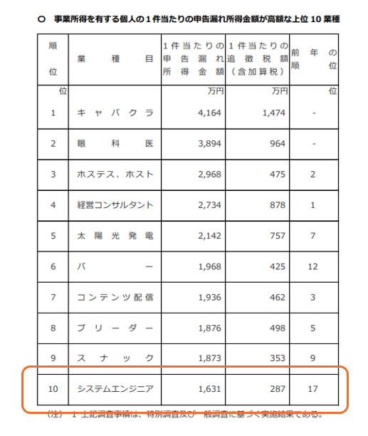 国税庁が公表した令和6事務年度の「事業所得を有する個人の1件当たりの申告漏れ所得金額が高額な上位10業種」で、システムエンジニアが前年の17位から10位に急上昇しました。1件当たりの申告漏れ所得金額は1,631万円、追徴税額は287万円です。
